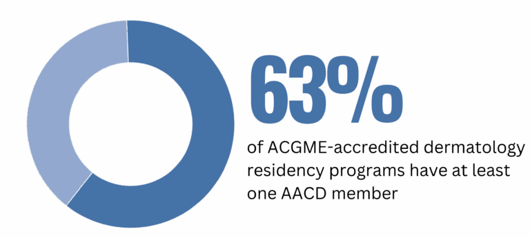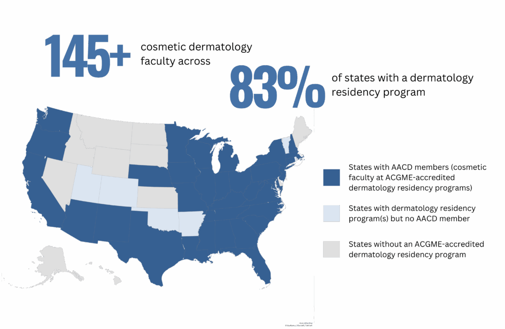 Our 130+ members are all board-certified dermatologists who are responsible for directing the education of dermatology residents in cosmetic and laser dermatology.  AACD members represent 60% of ACGME-accredited dermatology residency programs across nearly all states that have a residency program.  Every year, our members teach around 1,000 dermatology residents.